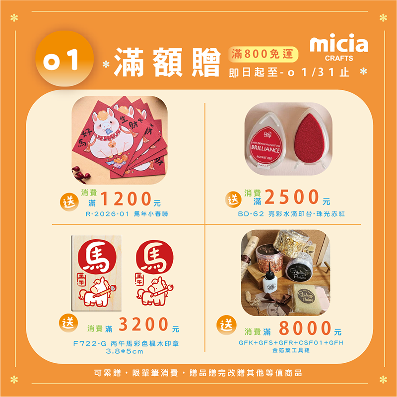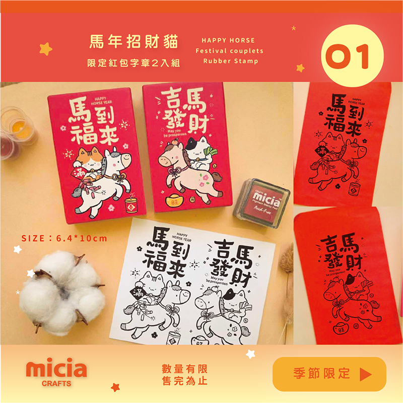 (滿 8000 全送全都送 馬年小春聯 +亮彩水滴印台紅 +F722-G 丙午馬彩色楓木印章3.8*5cm+GFK金箔葉工具組 )