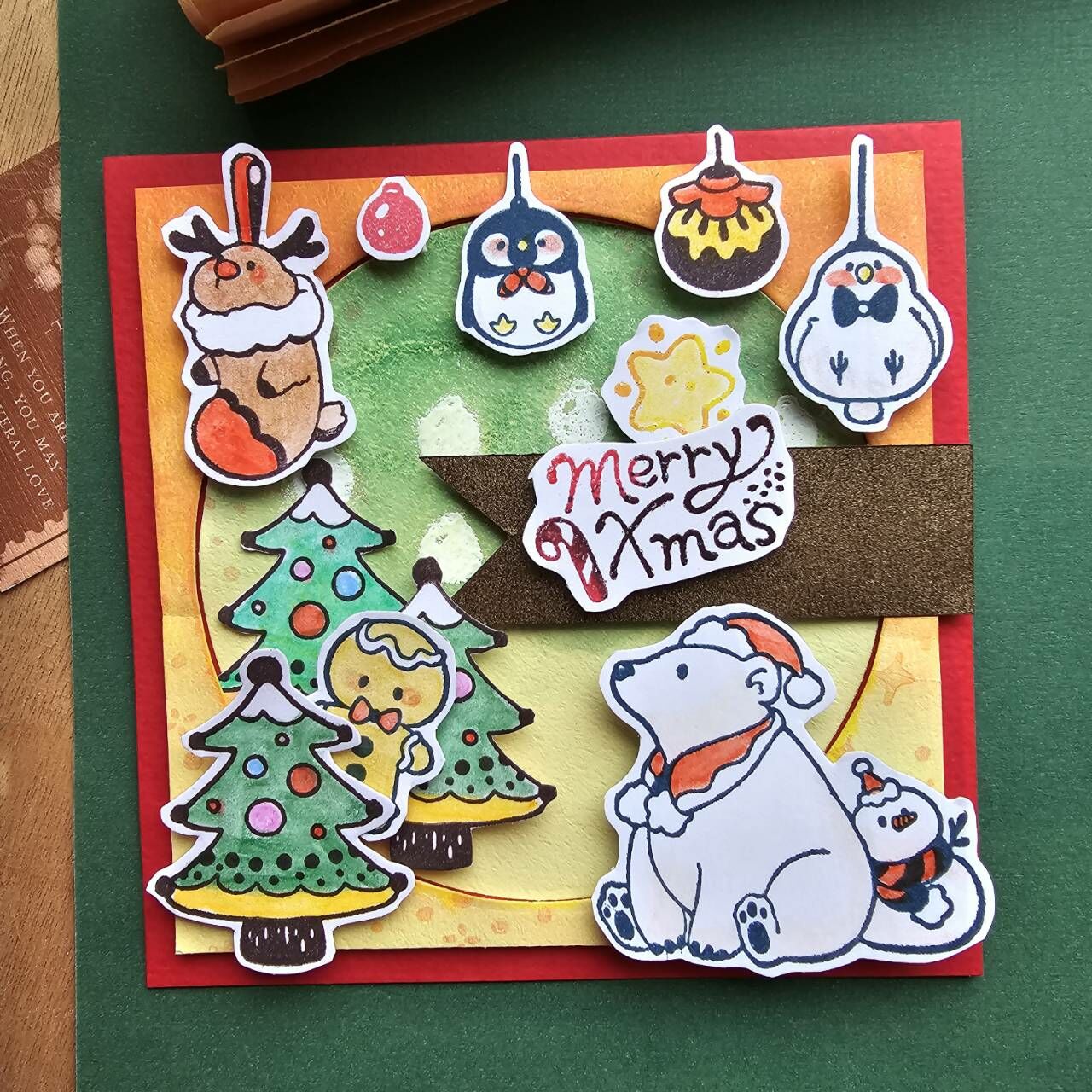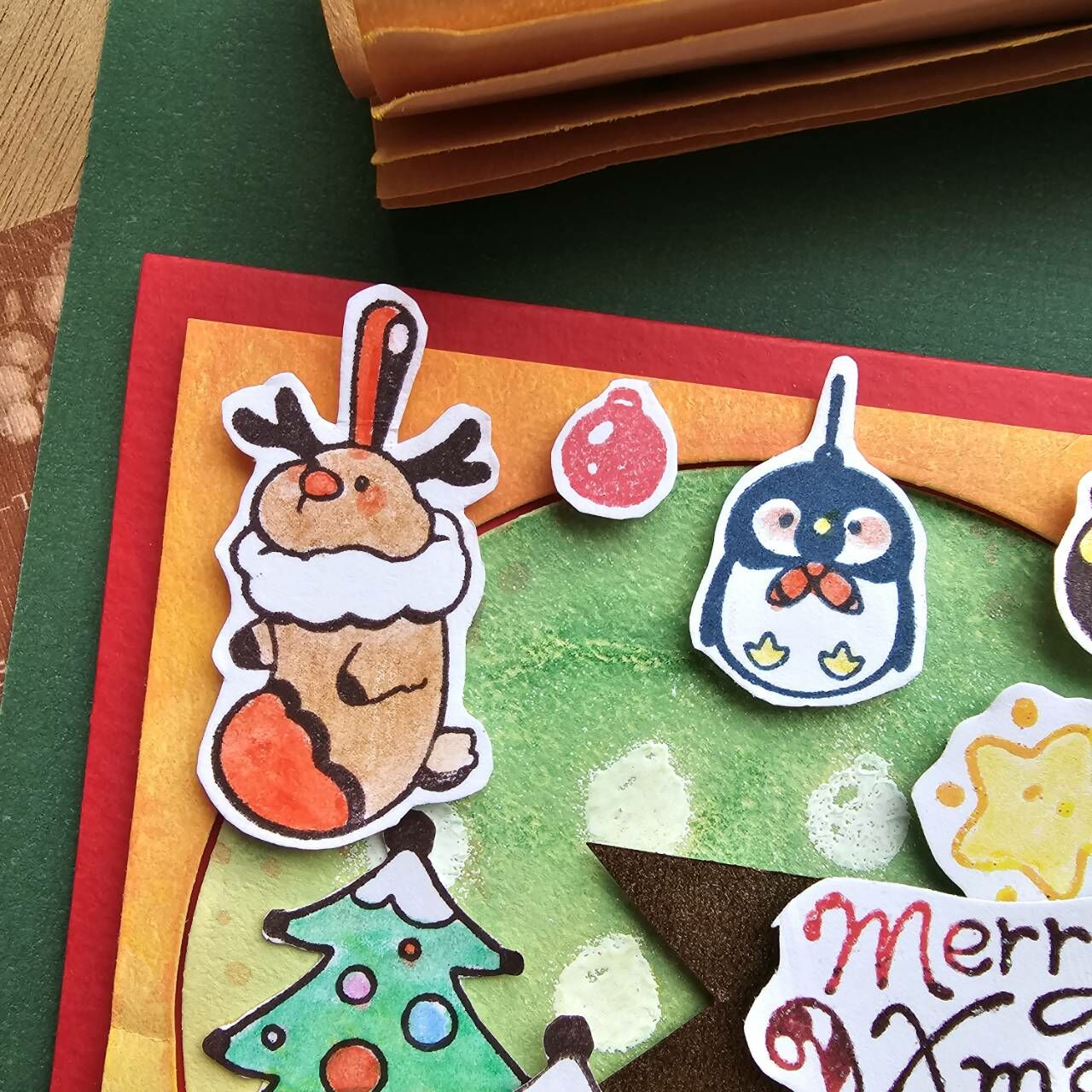Cute and round birds and penguins Christmas ornaments hang from the ceiling.